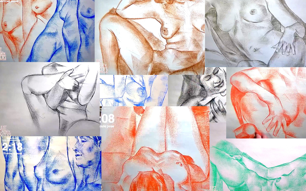 First group of the time-lapse videos, 24 unique drawings. All are about 1-minute long, compressed from originals ranging from 3 to 15 minutes, all drawn from life, some over Zoom. Models include Scarlet, Rose, Elena, Whitney, Sofia, and Rowan.