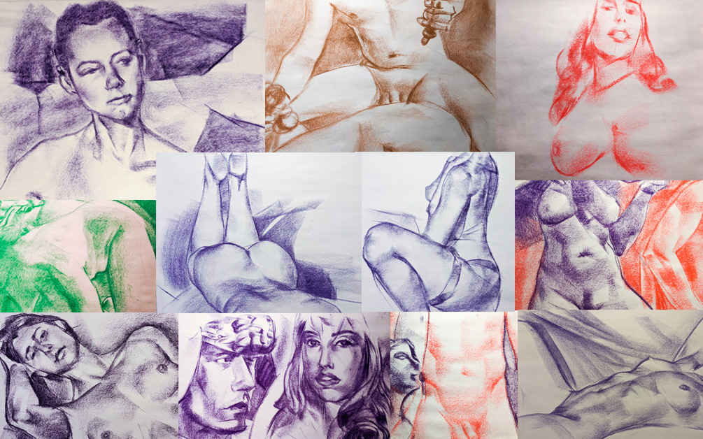 Second group of the time-lapse videos with 24 unique drawings. All are about 1-minute long, compressed from originals ranging from 3 to 15 minutes, all drawn from life, some over Zoom. Models include Elena, Emma, Rebecca & Aleksander, Elia, and Becca.